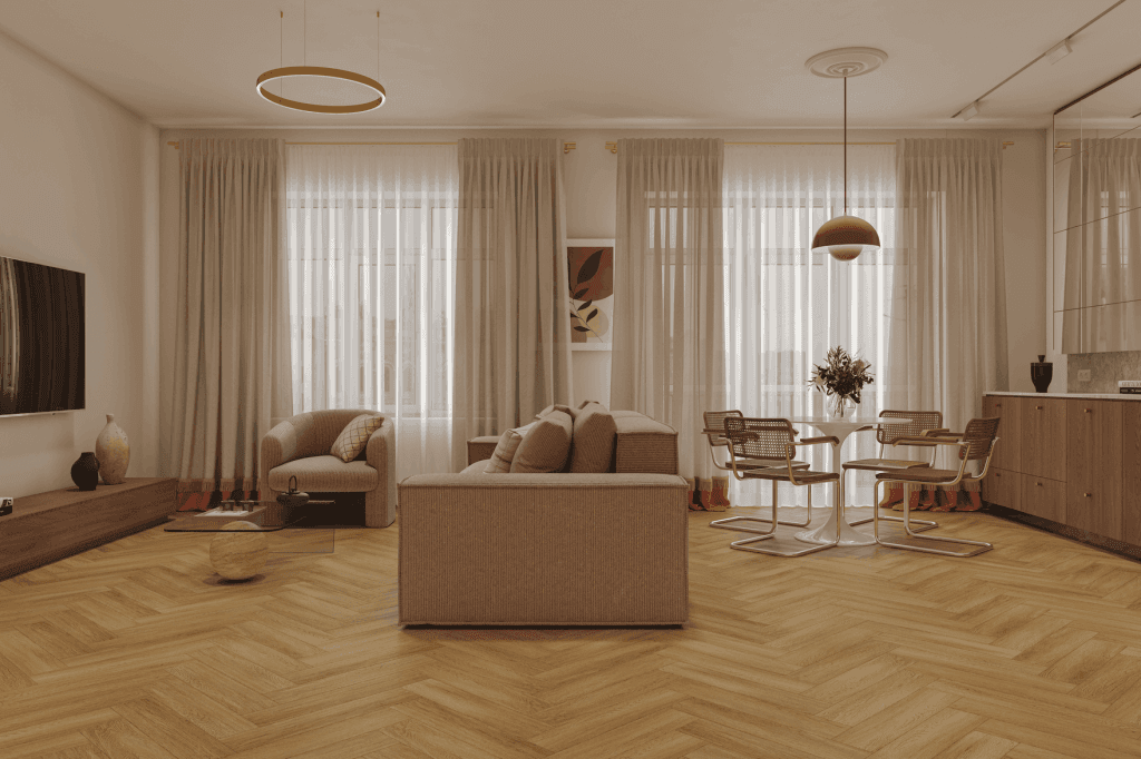 NORLAND PARQUET S 1055-14 Provence представлен в привлекательном ореховом оттенке. Натуральная текстура древесины передана с точностью благодаря полуматовой поверхности, добавляющей ламинату особую глубину и богатство. Тиснение обеспечивает плавный переход между элементами, подходящее для современного интерьера.